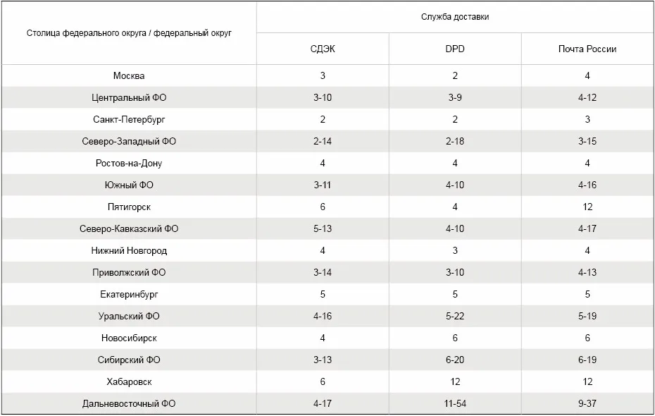 Сроки доставки заказов курьерскими службами СДЭК, DPD и Почтой России в рабочих днях с момента подтверждения оплаты заказа